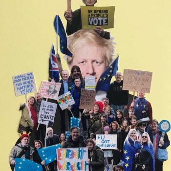 The Photographs were taken in the two major anti Brexit marches in 2019. I asked protesters if I can photograph them and took their emails. I emailed everybody with their photographs and asked for permission to use them. With my photographs I created a number of collages for a group exhibition at the Stash Gallery in London. A few of the collages are displayed together with some of the photographs.